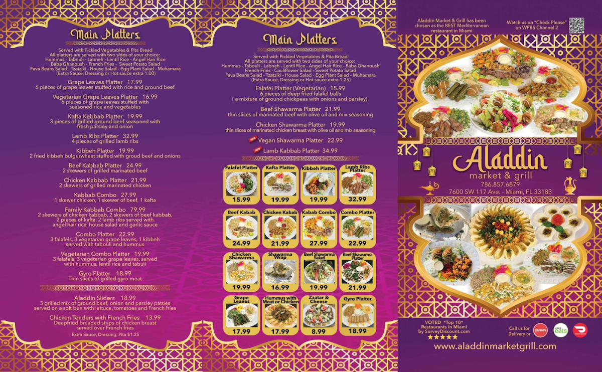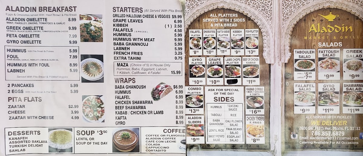 Welcome to Aladdin Market & Grill, a delightful culinary haven nestled at 7600 SW 117th Ave, Miami. This gem serves up authentic Mediterranean flavors that transport you straight to the heart of the region. Whether you're in the mood for breakfast, lunch, or dinner, their Falafel, Shawarma, and Gyro dishes shine brightly on the menu.